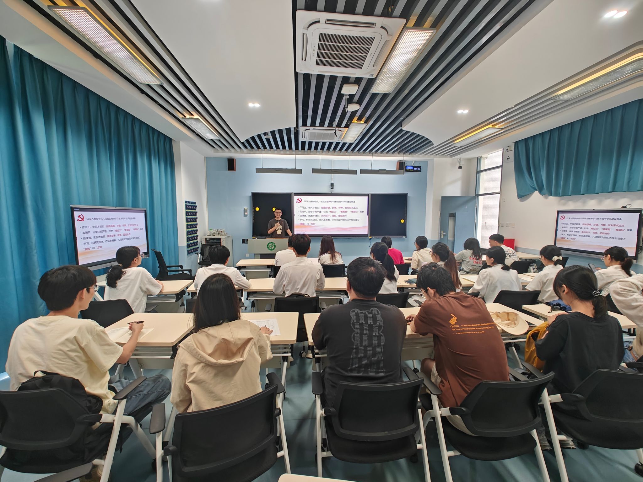活动伊始,党支部书记刘文渊领学中央八项规定及其实施细则精神,并作《扎实开展学习教育 筑牢学风建设根基》主题报告,深刻阐释作风建设与学风建设的三重辩证关系——规矩严方得研学精,应破除学习功利导向与不良习气;学风实方能作风正,需坚决抵制浮躁抄袭与形式主义;自律强方有氛围清,需崇尚实干诚信与团结协作。刘文渊强调,学生党员要以“严、实、强”的标准要求自己,在学风建设中发挥先锋模范作用,发挥好三个带头作用:一是带头遵守校纪校规,严格执行课堂纪律、学术规范等各项规定,用自身的规矩意识为同学们树立标杆,营造风清气正的学习环境;二是带头潜心钻研学问,主动攻克学习难点,积极参与学术研讨,以勤学善思的态度带动班级学习氛围,激发求知热情;三是带头关心帮助同学,发挥朋辈育人作用,协助解决学业困惑,在互助共进中凝聚力量,让优良学风在团结协作中不断传承。随后,支部全体党员展开交流研讨,分享了各自参与朋辈辅学、监督课堂纪律等学风建设志愿服务活动中的心得体会,为推进学院学风整体提升提供了新思路。