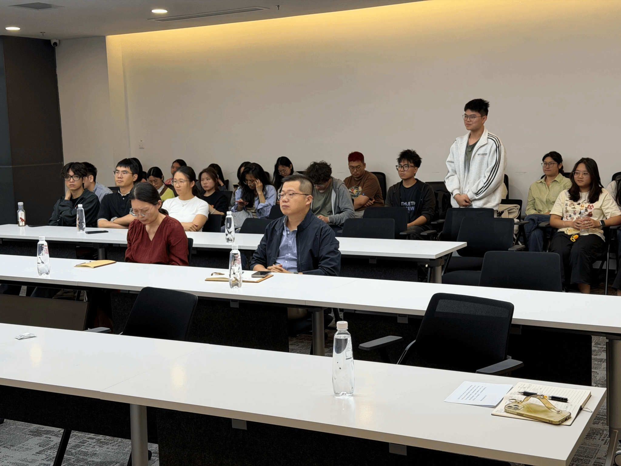 报告会上,赵弘博以《酶制剂的生物智造和产业化》为题,系统介绍了生物制造产业的发展脉络与前沿技术。报告不仅涵盖了从传统生物制造到“生物智造5.0”的范式转变、工业酶的挖掘与高通量筛选等核心技术,更融入了赵弘博在酶制剂开发与转化实践中的宝贵经验。赵弘博详细分享了新一代植酸酶开发和果汁糖分减量等产业化案例,深入探讨了AI辅助蛋白设计在酶工程中的应用突破与当前面临的瓶颈,强调了湿实验验证在生物制造领域不可替代的核心地位,为在场师生呈现了一场理论与产业应用深度融合的学术盛宴。在互动环节,师生们围绕AI赋能酶工程的局限性、工业酶的规模化生产挑战以及数据驱动的酶定向进化技术等热点问题,与赵弘博展开了深入交流,现场学术氛围浓厚,讨论热烈而深入。