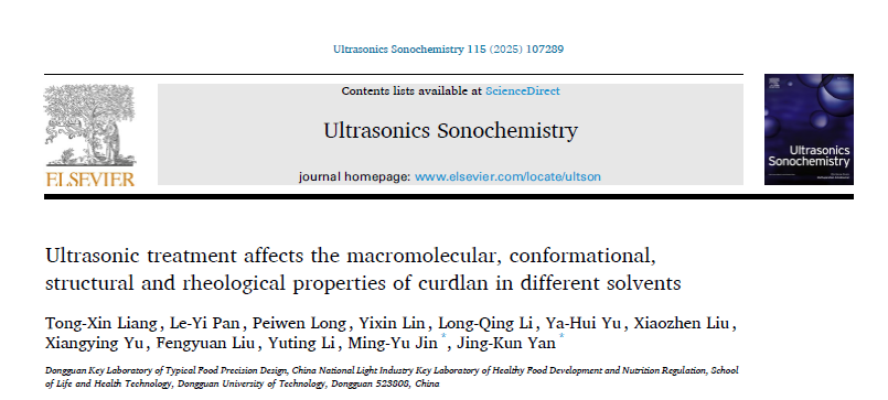 2022级食品质量与安全专业本科生梁桐欣以第一作者在国际学术期刊《Ultrasonics Sonochemistry》(中科院1区,影响因子8.7) 上发表题为“Ultrasonic treatment affects the macromolecular, conformational, structural and rheological properties of curdlan in different solvents”的研究性文章,2022级食品质量与安全专业本科生潘乐怡为第二作者,金明玉博士和闫景坤教授为通讯作者。
