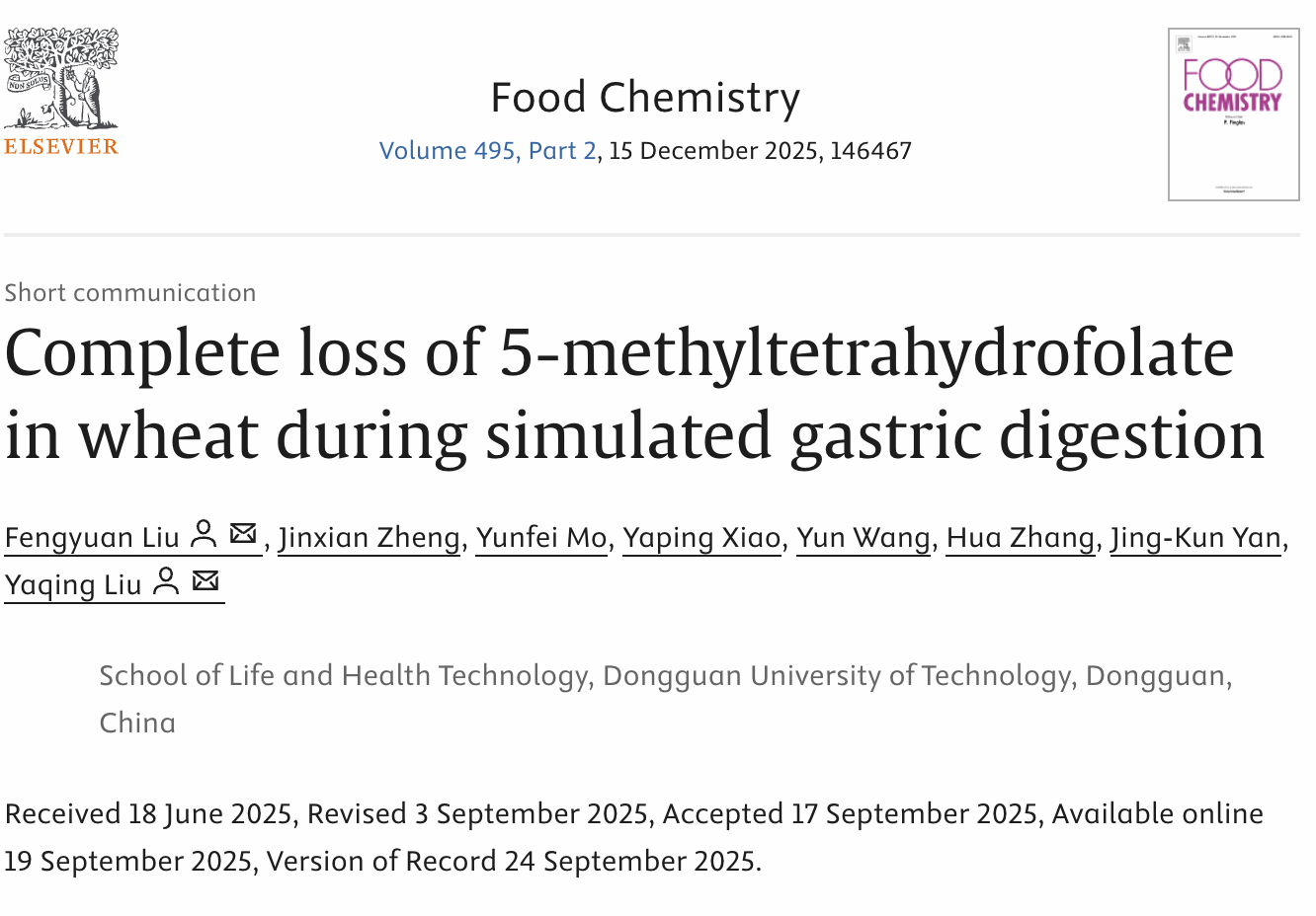 刘亚青教授团队于国际食品顶级期刊《Food Chemistry》(IF = 9.8)在线发表题为“Complete loss of 5-methyltetrahydrofolate in wheat during simulated gastric digestion”的快报研究性文章。海角网
