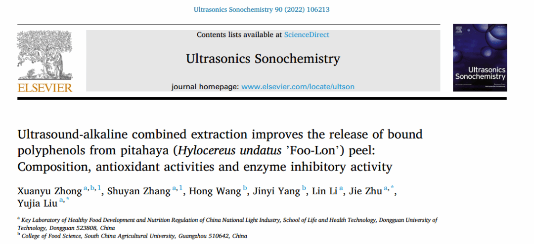 本研究以《Ultrasound-alkaline combined extraction improves the release of bound polyphenols from pitahaya (Hylocereus undatus ’Foo-Lon’) peel: Composition, antioxidant activities and enzyme inhibitory activity》为题发表在SCI收录期刊《Ultrasonics Sonochemistry》(IF2021= 9.34,1区TOP)。海角网