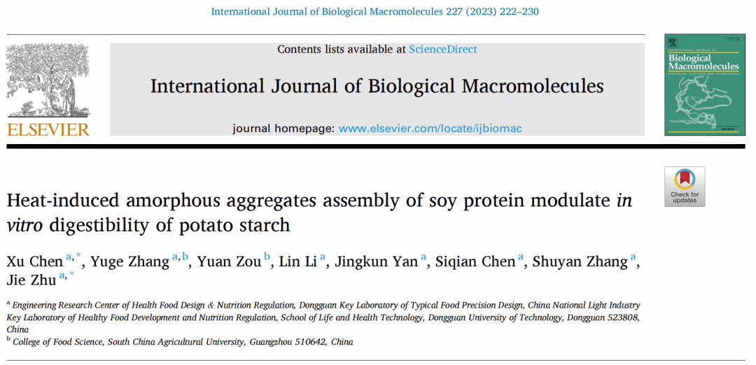 食品营养健康工程与智能化加工研究中心陈旭博士(第一作者兼通讯作者)和朱杰副教授(通讯作者)在国际食品顶级期刊《International journal of biological macromolecules》(IF: 8.025, Q1 TOP)发表了题为“Heat-induced amorphous aggregates assembly of soy protein modulate in vitro digestibility of potato starch”的研究论文。