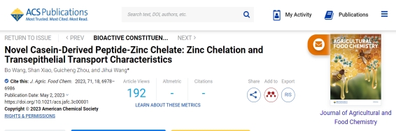 王际辉教授团队在国际食品顶级期刊《Journal of Agricultural and Food Chemistry》在线发表题为“Novel Casein-Derived Peptide-Zinc Chelate: Zinc Chelation and Transepithelial Transport Characteristics”的研究性文章。论文第一作者为王波特聘副教授,通讯作者为王际辉教授。