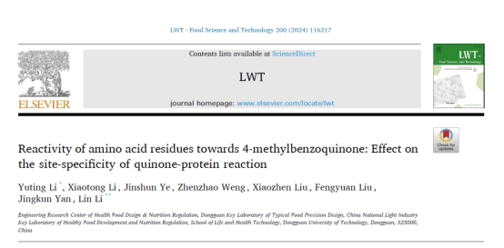 李琳教授团队于国际食品顶级期刊《LWT-Food Science and Technology》在线发表题为“Reactivity of amino acid residues towards 4-methylbenzoquinone: Effect on the site-specificity of quinone-protein reaction”的研究性文章。论文第一作者为李玉婷副教授,通讯作者为李琳教授。
