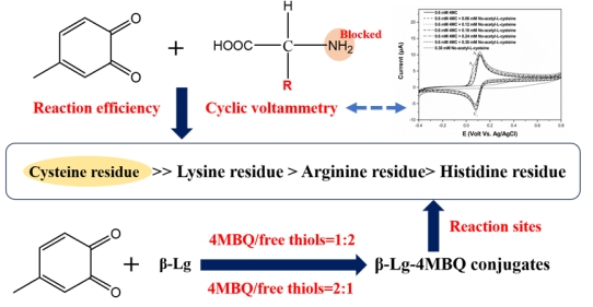 醌类物质与蛋白质的反应可以显著改变蛋白质的结构和功能特性,通过调节反应位点来控制醌类物质与蛋白质之间的反应对于提高食品产品质量至关重要。本研究通过循环伏安法确定了20种不同氨基酸残基与4-甲基邻苯二醌(4MBQ)的相对反应性以及4MBQ与β-乳球蛋白(β-Lg)的反应效率,同时探讨了4MBQ浓度对其与蛋白质反应位点的影响。
