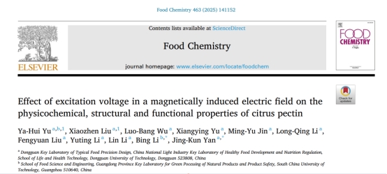 闫景坤教授团队于国际学术期刊《Food Chemistry》(中科院JCR 1区)在线发表题为“Effect of excitation voltage in a magnetically induced electric field on the physicochemical, structural and functional properties of citrus pectin”的研究性文章。论文第一作者为于亚辉博士,通讯作者为闫景坤教授。