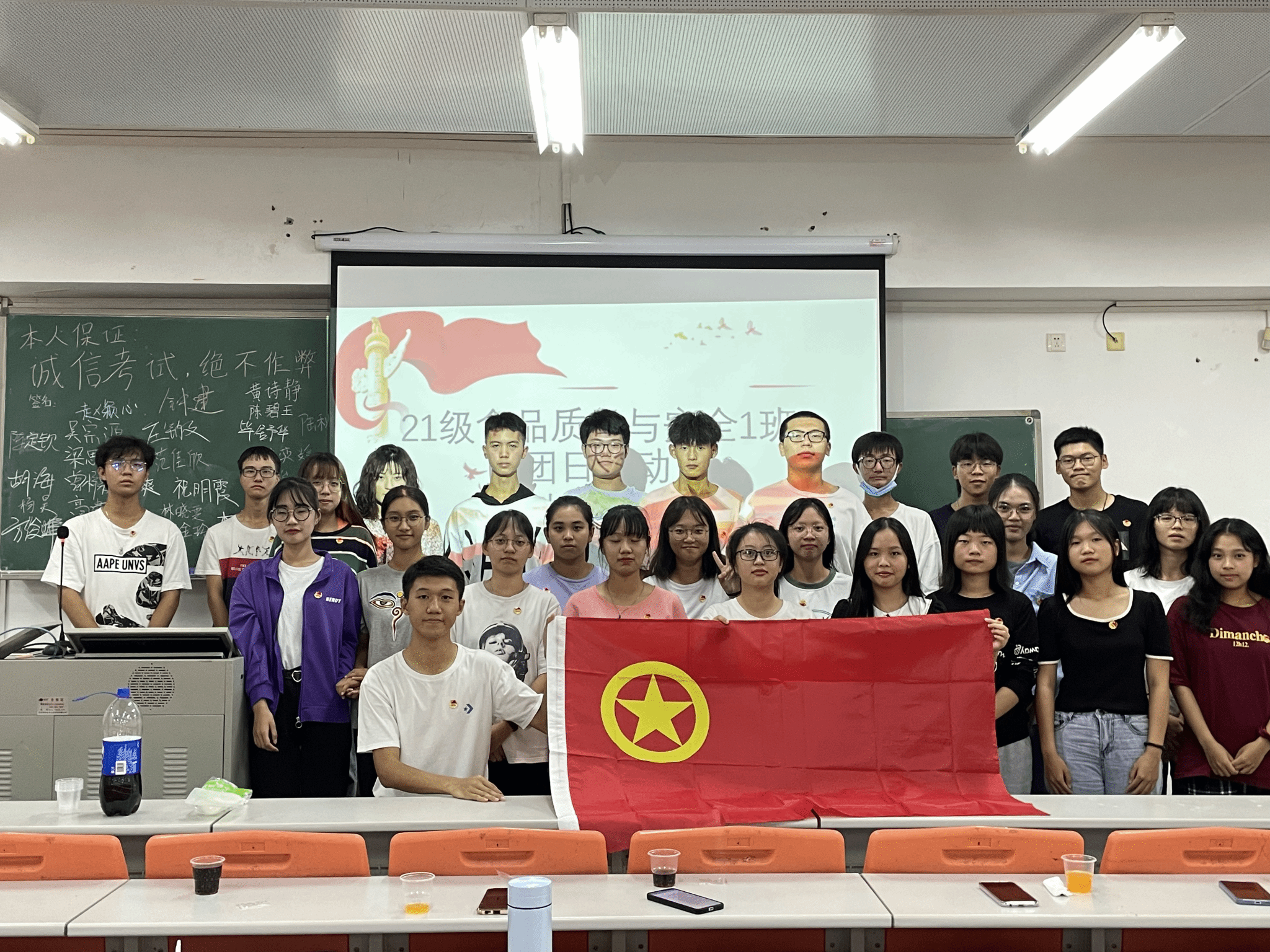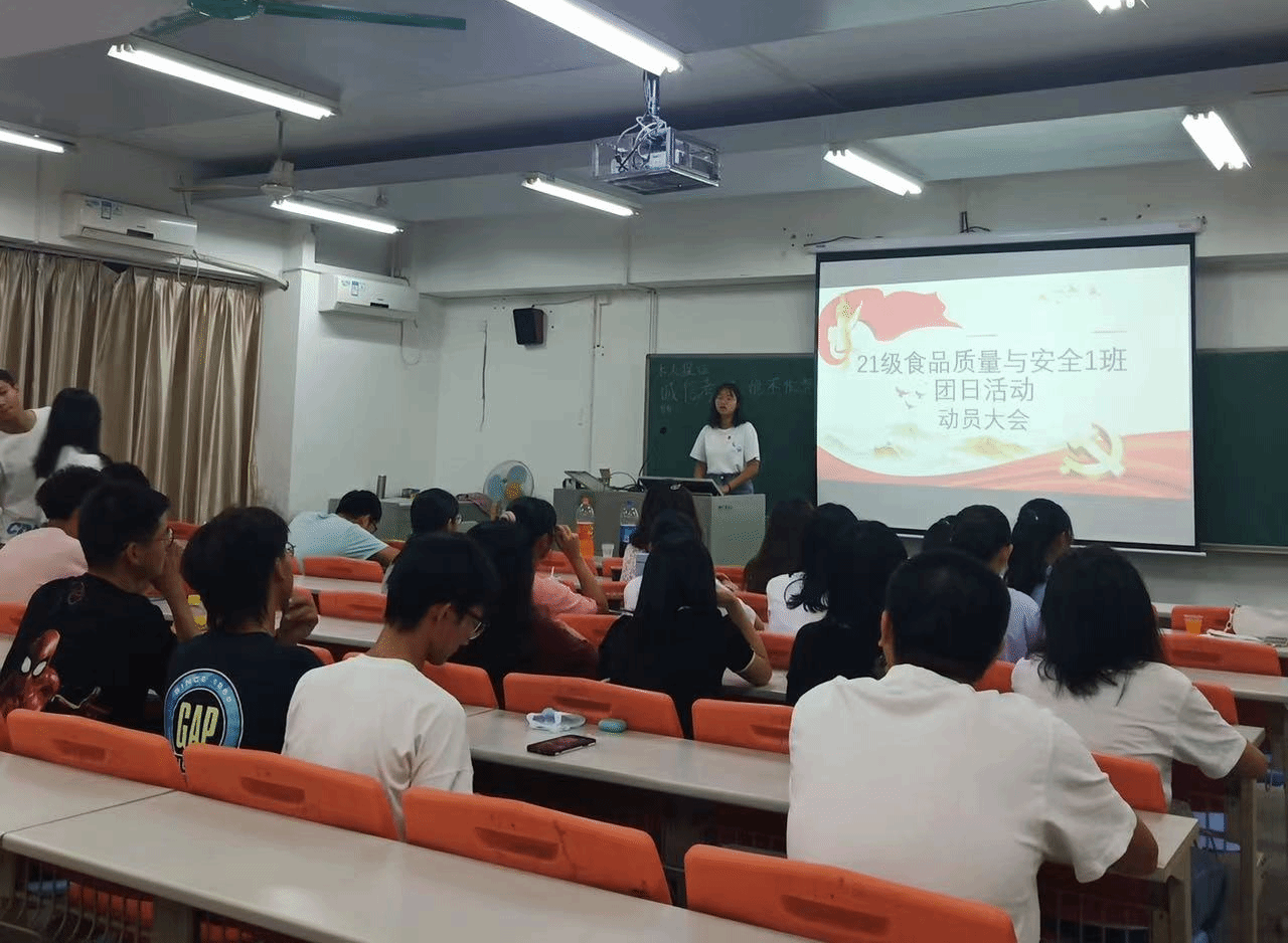 2021年10月19日晚上7:30,21食品质量与安全一班团支书赵颖心在松山湖校区教学楼7B208为全班同学开了一场学风建设的主题班会兼团日活动。
