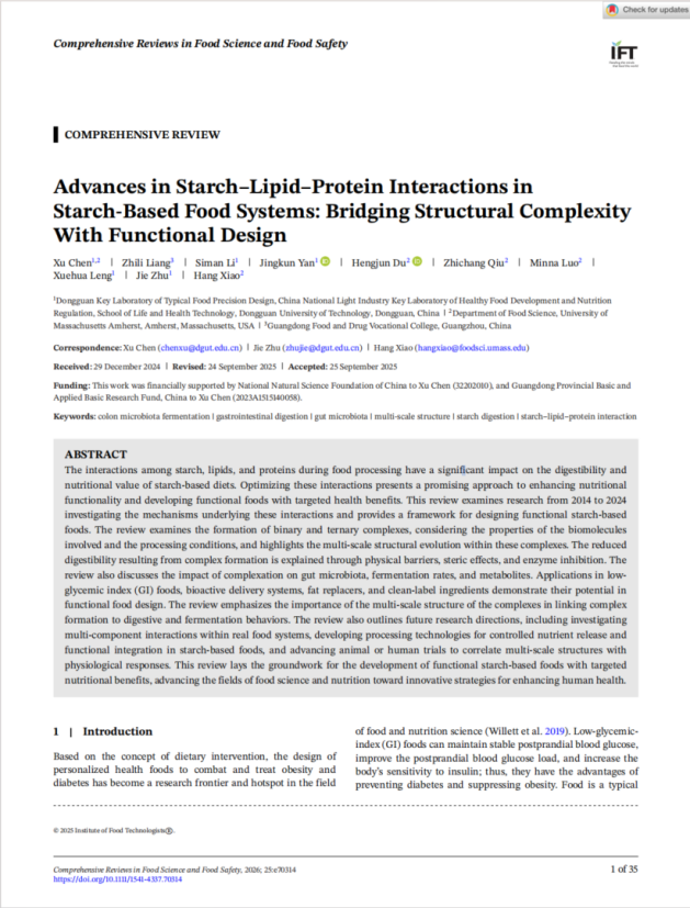 2025年11月,海角网 朱杰教授团队在国际食品Top期刊《Comprehensive Reviews in Food Science and Food Safety》(Q1,IF:14.1)发表题为“Advances in Starch–Lipid–Protein Interactions in Starch-Based Food Systems: Bridging Structural Complexity With Functional Design”的封面综述文章。陈旭副教授为论文第一作者和通讯作者,朱杰教授、肖航教授为共同通讯作者。该成果为陈旭副教授在美国马萨诸塞大学阿...
